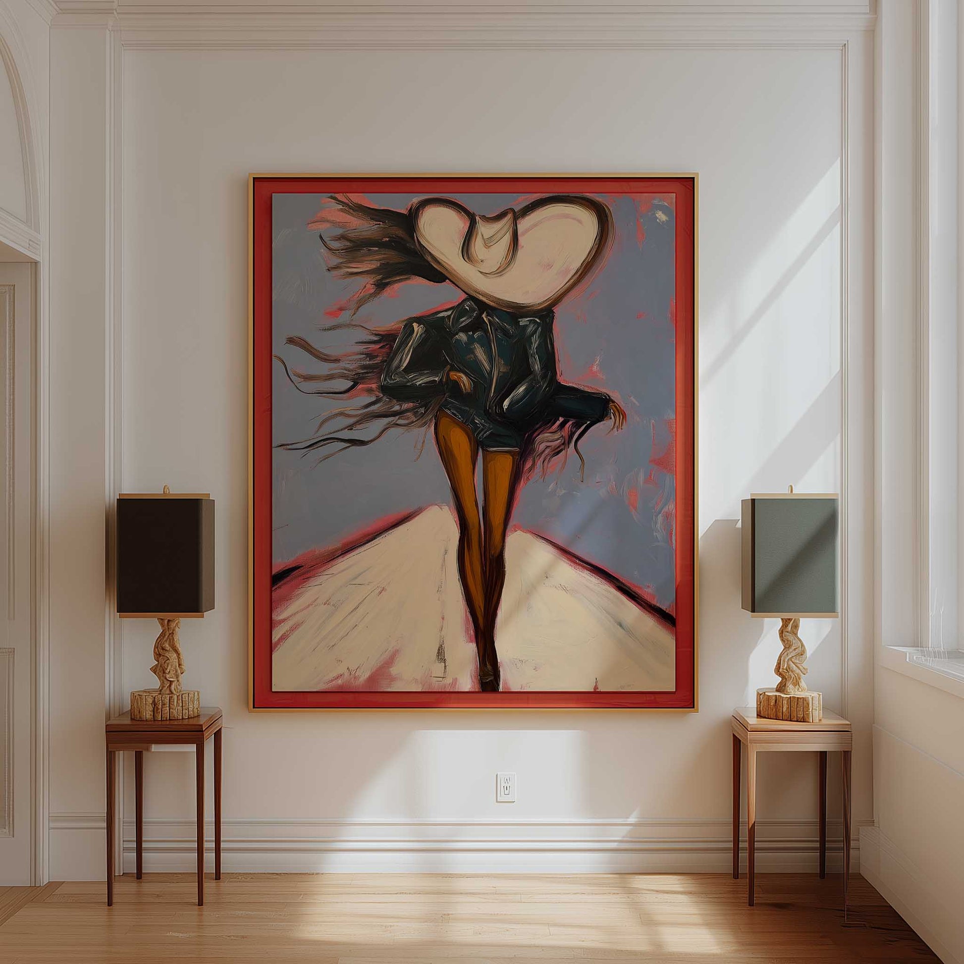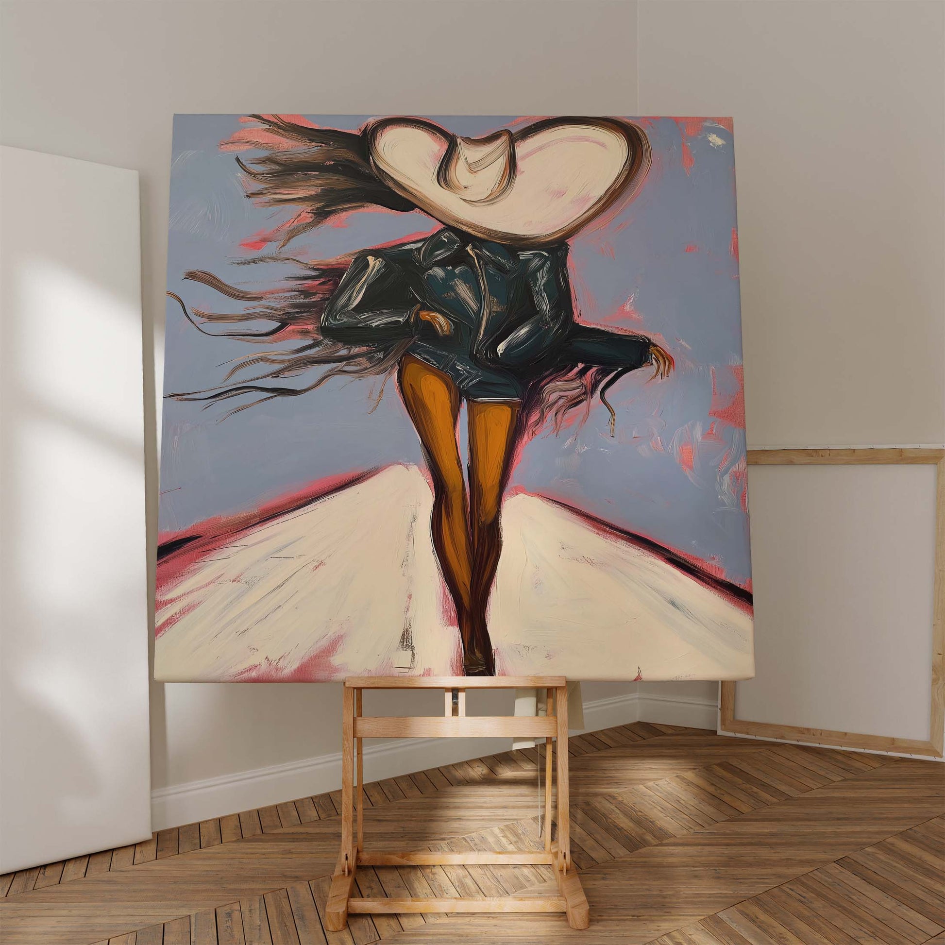 A cowgirl striding across a windswept desert — dynamic, free-spirited, and alive with motion.